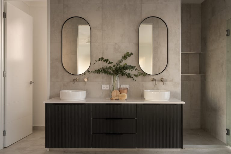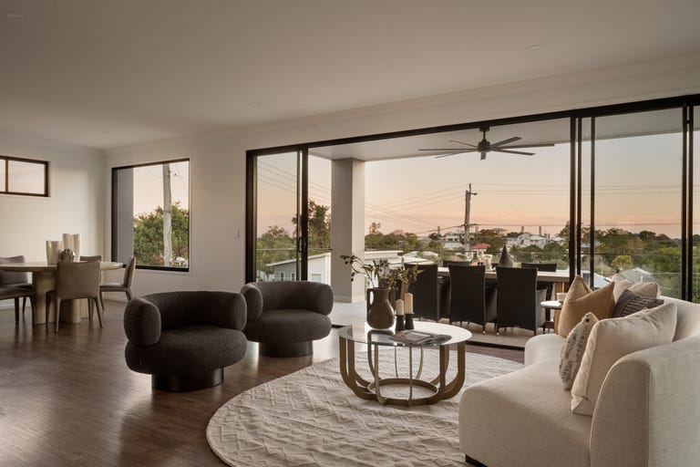 Elevated on a 675sqm parcel with a 20m frontage, north rear aspect and city glimpses above the leafy landscape, the house blends a beautiful backdrop with immersive interiors of stunning stone, engineered floorboards, floor-to-ceiling tiles and brushed metal fittings below 2.7-metre ceilings.