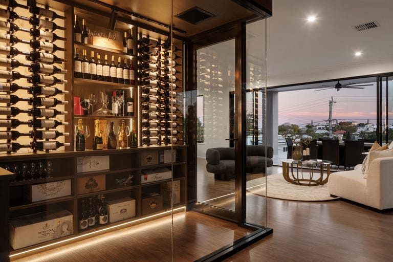 - Bespoke temp-controlled wine cellar with glass displays