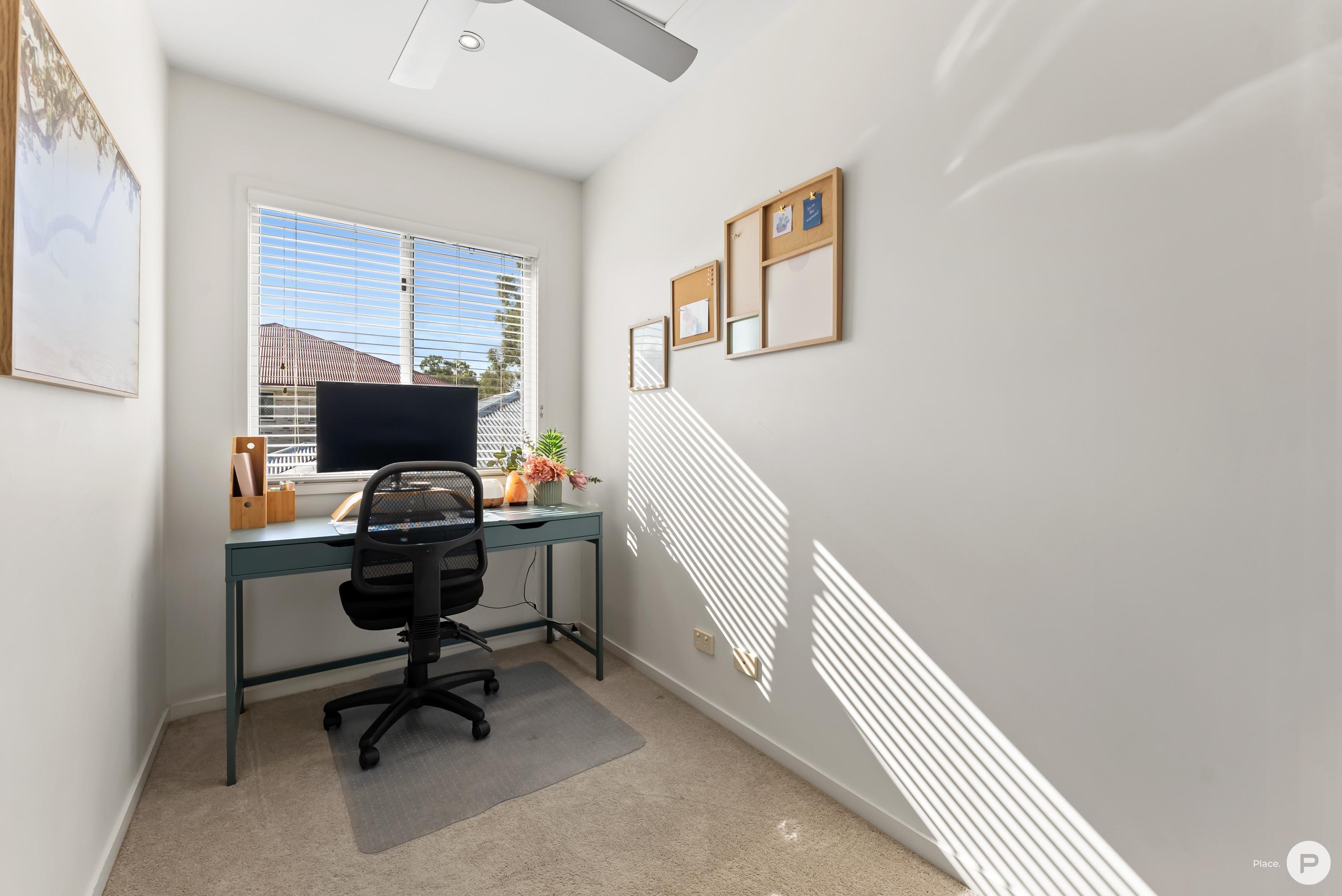 The upper level boasts two generous bedrooms, with the master featuring an ensuite, and balcony offering views of neighbouring greenery. The master bathroom has a large vanity with single basin, oversized mirror and shower-over-bath, with the final room being a generous private office with tv antenna ports and separate NBN connection.